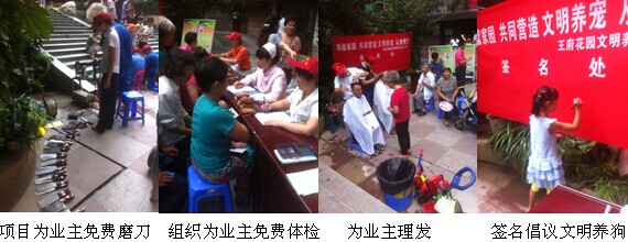 中秋前,公司聯(lián)絡(luò )了一批社會(huì )志愿組織為小區業(yè)主送福利,學(xué)雷鋒,通過(guò)為業(yè)主提供免費的磨刀、理發(fā)、檢查身體以及組織員工獻血等活動(dòng)拉近了與業(yè)主的距離,許多業(yè)主口口相傳,并希望這樣的活動(dòng)能夠長(cháng)久、持續的進(jìn)行下去。