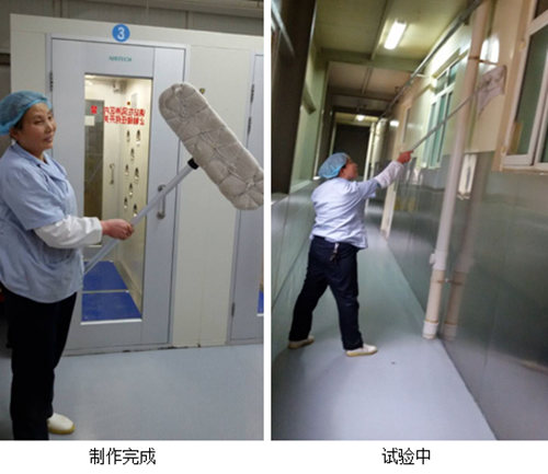 針對高空作業(yè),周進(jìn)大姐將塵推的桿子改進(jìn)成可以自由伸縮的桿子,對高處的窗子采用滾筒方式的塵推,這樣用起來(lái)更順手省力。對于地面,她提議用排拖來(lái)加大作業(yè)面積。為了節能降耗,她建議將塵推做成可以換頭的。在肖經(jīng)理和工廠(chǎng)相關(guān)部門(mén)的支持下,塵推成品制成了。經(jīng)過(guò)了幾天的使用,達到了預期的清潔效果。如今,廠(chǎng)方領(lǐng)導也借鑒了項目中心的廢物再利用,并將此推薦給車(chē)間內的員工使用。