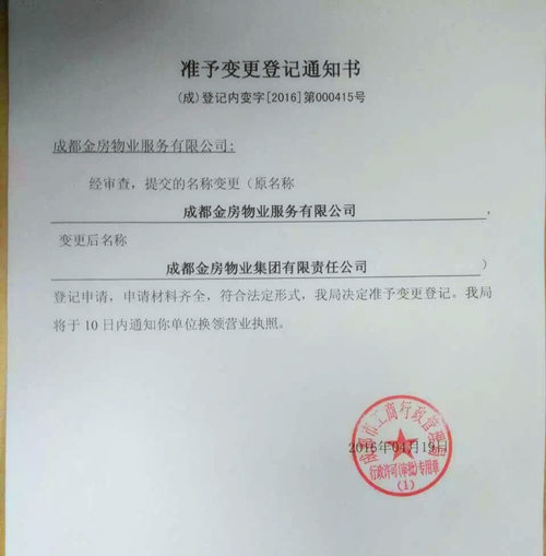 2016年4月19日,“成都金房物業(yè)服務(wù)有限公司”正式變更為“成都金房物業(yè)集團有限責任公司”。成都金房物業(yè)成立于1998年,是國家物業(yè)管理一級資質(zhì)企業(yè)(編號:110032),中國物業(yè)管理協(xié)會(huì )副會(huì )長(cháng)單位,2015中國物業(yè)綜合實(shí)力百強企業(yè),2015履行社會(huì )責任優(yōu)秀企業(yè),成都市物業(yè)管理協(xié)會(huì )會(huì )長(cháng)單位,成都市物業(yè)服務(wù)行業(yè)品牌企業(yè)。公司歷經(jīng)20余年的發(fā)展,服務(wù)有居住物業(yè)(多層、高層、別墅)和非居物業(yè)(商務(wù)樓、商場(chǎng)、學(xué)校、醫院、工業(yè)園)等多種類(lèi)型300余個(gè)項目。截止2016年4月底,共成立分公司 61 個(gè),管理面積達3000多萬(wàn)平方米。金房物業(yè)集團以“完全依托市場(chǎng),提供全方位服務(wù)、重信義、重社會(huì )責任感”為特點(diǎn)的專(zhuān)業(yè)化服務(wù)公司。成都金房物業(yè)集團旗下目前有成都金鄰物業(yè)管理有限責任公司、四川金瑞星物業(yè)管理有限公司、四川金基家業(yè)科技有限公司、成都天啟運道文化傳播有限公司四家獨立控股的子公司。