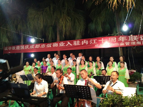 夜幕漸漸降臨,業(yè)主們早早地來(lái)到晚會(huì )現場(chǎng),晚會(huì )在演奏者們歡騰的樂(lè )曲聲中拉開(kāi)了序幕。首先由內江樂(lè )團給大家表演了大合唱《歌唱祖國》,演唱者個(gè)個(gè)昂首挺胸,激情飽滿(mǎn),唱出了中華兒女對祖國的熱愛(ài)之情。接著(zhù)是歌伴舞«獻給秋天的歌»,一群身著(zhù)藏族服裝的表演者手拉手載歌載舞,動(dòng)感激情的舞姿以及完美的音樂(lè ),深深感染了在場(chǎng)觀(guān)眾。小區業(yè)主和同事們也爭先獻上他們的才藝,演唱了《小白楊》、《說(shuō)句心里話(huà)》等,深情流露贏(yíng)得了陣陣掌聲。